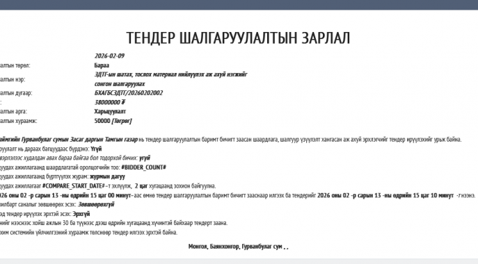 ТЕНДЕР ЗАРЛАГДЛАА