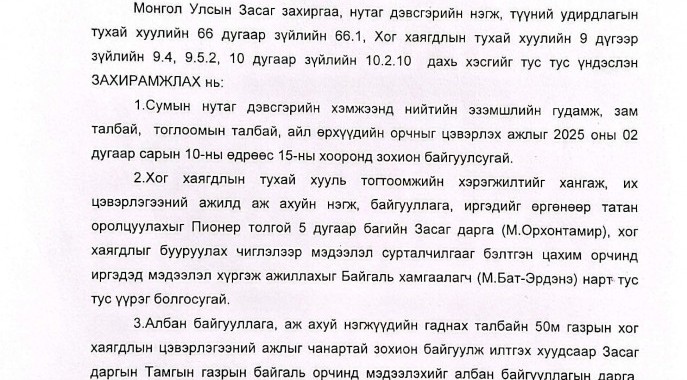 Монгол түмний цагаан сарын баярыг угтан бүх нийтийн цэвэрлэгээ зохион байгуулах тухай сумын Засаг даргын Захирамжыг танилцуулж байна.